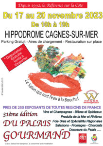 On commence par …. le traditionnel « Salon Gourmand de Cagnes-sur-Mer » qui se déroulera du 17 au 20 Novembre à l’Hippodrome, de 10h à 19h.