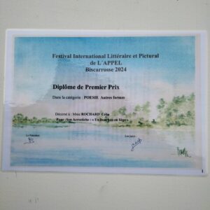 Au Festival International Littéraire et Pictural de l’APPEL (Biscarrosse 2024), Célia a reçu le Diplôme du 1er Prix dans la catégorie « Poésie-autres formes », pour un poème sur le bouchon.
