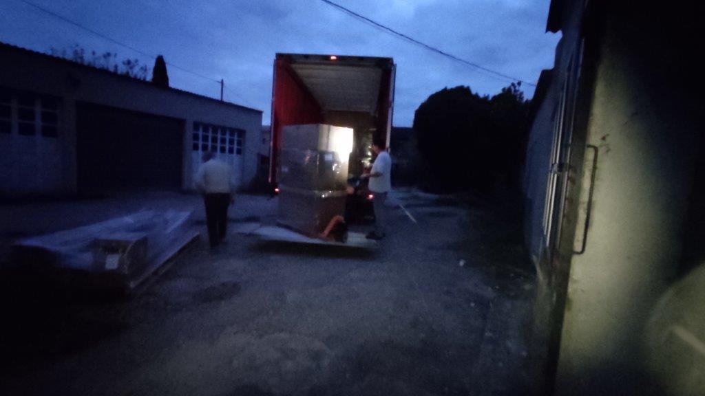 Nous avons innové cette fois-ci car le camion est arrivé à la tombée de la nuit (changement d’heure ….)Le chargement s’est donc effectué à la lueur de nos lampes frontales ( une première …tout de même !!!)